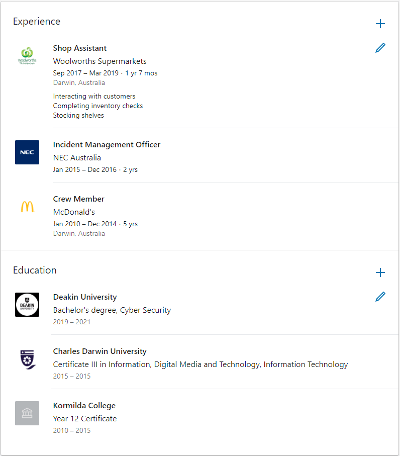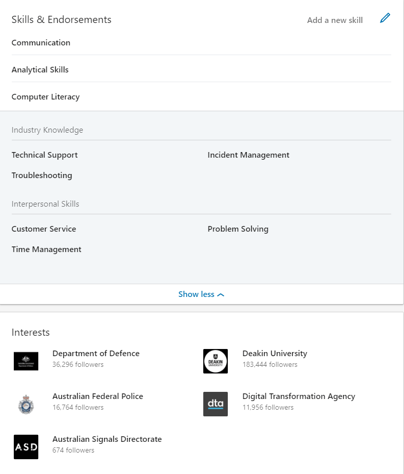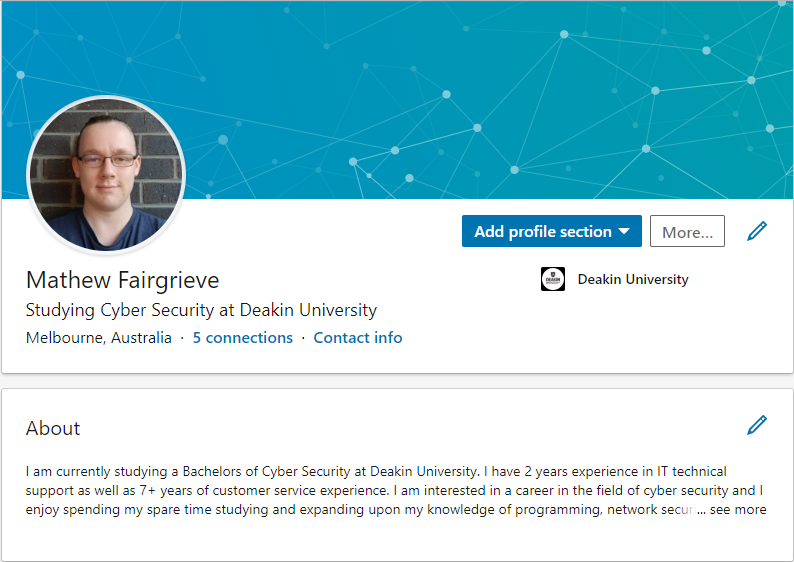 Below is a screenshot of my LinkedIn profile. When creating this profile, I decided to connect with the following Government departments: Australian Signals Directorate, Digital Transformation Agency, Department of Defence, and the Australian Federal Police. I decided to connect with these organisations as I would like to work there upon graduating or conduct an internship while still studying. I wish to work there because of the opportunities available in Cyber Security. All of these government agencies conduct internship rotations that allow students to gain experience in multiple areas of cyber security. They also all have graduate programs that would be a great entry point in the working world.